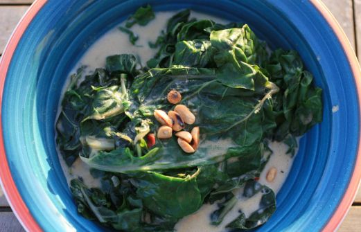 Viele Gerichte in Afrika werden in cremiger Erdnuss-Sauce bzw. -Suppe gekocht. Die Kombination mit frischem Spinat und feuriger Chili schmeckt mir besonders gut.