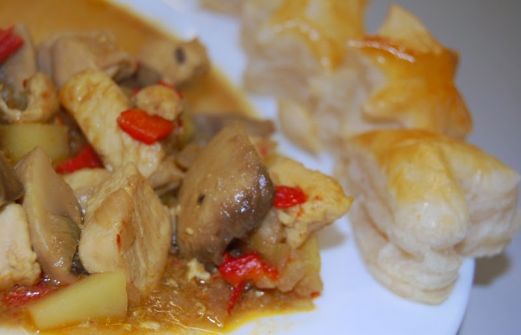 Zutaten: für das Geschnetzelte: 2 Esslöffel Butter 2 große Zwiebeln 1 rote Paprikaschote 500 g geschnetzeltes Putenfleisch ½ Liter Hühnerbrühe (Instant) 300 g frische Champignons Salz und Pfeffer aus der Mühle 1 Teelöffel Currypulver für die Herzen: 1 Paket Blätterteig 1 Eigelb Salz
