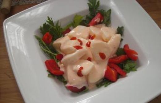 Zutaten für Personen Rezept mit Bild: Tintenfisch-Cocktail auf Rucola-Paprika Bild einstellen 500 g Tintenfischfilet vom Riesenkalmar 150 g Joghurt 150 g Mayonaise 100 ml Sweet-Chili-Sauce 2 EL C [...]