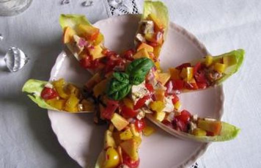 Zutaten für Personen Bild einstellen 1 Stück kleine rote Zwiebel 1 Stück Paprikaschote gelb oder Grün 2 Stück Strauchtomaten 1 Stück reifer Pfirsich oder Nektarine 2 EL weißer Balsamico-Essig 3 EL Olivenöl Salz, sch [...]