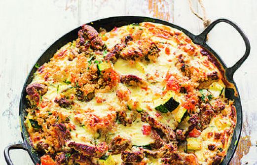 Lamm-Couscous mit Schafskäse Zutaten 250 g Instant-Couscous 500 g Lammkeule ohne Knochen 1/2 Bund Petersilie 1/2 Bund Minze 2 Zehen Knoblauch ½ Bio-Zitrone 4 EL Olivenöl Salz Pfeffer ½ TL Chiliflocken 200 g Tomaten 300 g junge Zucchini 200 g Schafskäse (Feta) 300 g J [...]