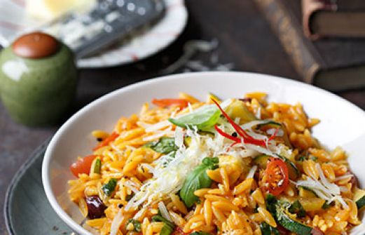 Kritharaki in Gemüse-Tomaten-Sauce Zutaten ca. 500 ml Gemüsebrühe (Instant oder selbst gekocht) 1 Msp. Safranfäden oder -pulver 1 kleine weiße Zwiebel 1 Knoblauchzehe 1 frische rote Chilischote 1 Stange Staudensellerie 1 dünner Zucchino 4-6 Cocktailtomaten oder kleine Strauch [...]