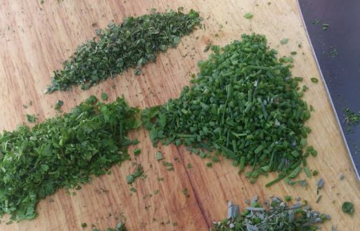 Um Kräuterbutter selbst zu machen benötigt man eigentlich nicht viel. Verschiedene Kräuter, am besten frische aus dem eigenen Garten, Butter und etwas Salz. Wir machen immer noch eine ordentliche Prise Chilipulver dran. Alles kleinschneiden und gut vermengen.