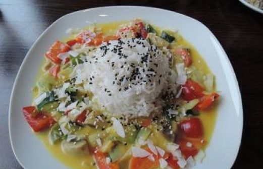 Zutaten für Personen Rezept mit Bild: Kokos - Gemüse - Curry - Wok an Reis mit schwarzem Sesam und Kokosflocken Bild einstellen 3 reife rote Paprika geschnitten 1 reife grüne Paprika geschnitten 1 mittelgrosse F [...]