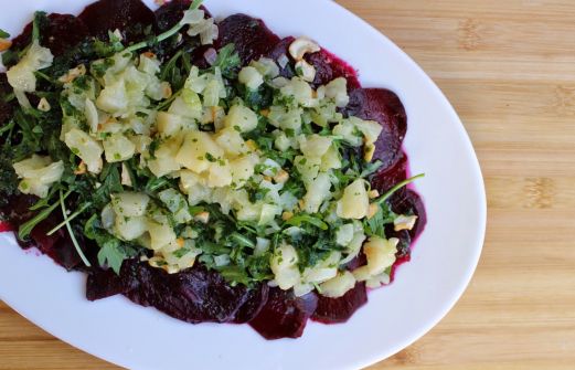 Carpaccio aus roter Bete mit angeschmelzten Birnen, Walnüssen und Rucola