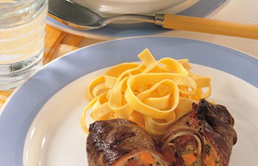 Rinderrouladen mit Möhrenfüllung Zutaten 4 junge Möhren 4 Essiggurken 1 Zwiebel 4 große Scheiben Rinderrouladen (je etwa 180 g) 4 TL scharfer Senf 8 dünne Scheiben durchwachsener Räucherspeck 2 EL Öl Salz Pfeffer 3/8 l Fleischbrühe 2 TL Tomatenmark Rouladennadeln [...]
