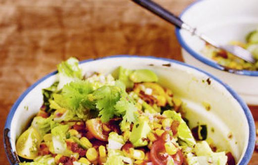 SAUSALITO-SALAT MIT SPECK Zutaten 200 g (bunte) Kirschtomaten 2 Mini-Romanasalate 1 kleine rote Zwiebel 1 Hass- Avocado 1/2 Bund Koriandergrün 1/2 grüne Chilischote (nach Belieben) 75 g durchwachsener Räucherspeck
