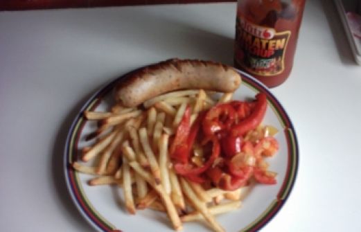 Zutaten für Personen Bild einstellen 2 Bratwürste grob 3 rote Paprikaschoten 1 kleine Zwiebel 3 Knoblauchzehen 500 gr. Pommes frites Fett,Salz,Pfeffer und Chili Rezept Zubereitung Bratwurst,geschmorte Pap [...]