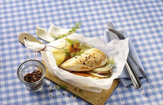 für 4 Personen 4 Stk Hähnchenbrüste 2 Knollen Fenchel und Grün 8 Stk Fingermöhren 2 Stk Zitronen 2 Stk Knoblauchzehen 30 g Zucker 2 EL Mandelöl Salz und Pfeffer aus der Mühle Chiliflocken nach Belieben Außerdem: 2 Blätter weißes Backpapier etwas Bratenschnur zum Binden Zubereitun [...]