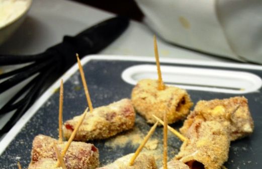 Zutaten: 150 g Serranoschinken Zahnstocher 3 Eier 4 Esslöffel Mehl 4 Esslöffel Paniermehl Frittieröl Zubereitung: Den Schinken auf der Arbeitsfläche ausbreiten. Die Längsseiten einer jeden Scheibe so weit einklappen, dass die Scheibe nahezu rechteckig ist. Dann die Scheibe aufrollen und mit ei [...]
