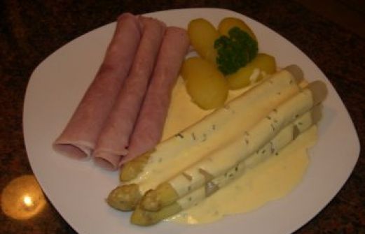 Zutaten für Personen Rezept mit Bild: Gemüse: WEISSER SPARGEL Bild einstellen 300 gr. Spargel frisch 5 Stk. Babykartoffeln 3 Scheibe Kochschinken 125 ml Sauce Hollandaise von LUKULL 0.25 Bd Schnittlau [...]