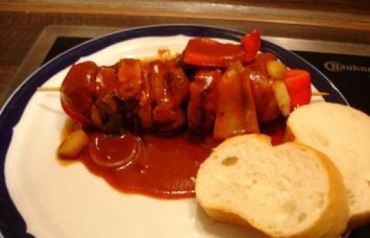 Zutaten für Personen Rezept mit Bild: Schaschlik Bild einstellen 800 g Schweinefilet / etwa 2 Filets 400 g mittelgroße Zwiebeln 3 Paprika / 1 rote / 1 grüne / 1 gelbe 2 EL Pfannenbutter oder B [...]