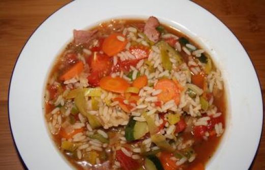 Zutaten für Personen Bild einstellen 1 Zucchini frisch 6 Tomaten frisch 1 Lauchstange 100 g Erbsen grün frisch 3 Möhren 4 Schalotten 2 Knoblauchzehen 200 g Italienischer Schinken roh 150 g Langkornreis 3 E [...]