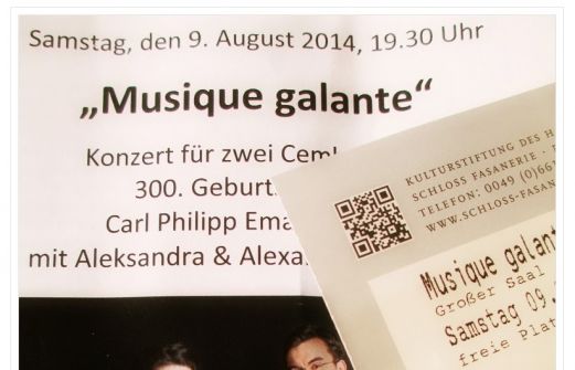 Am Samstagabend zog es unser kleines Grüppchen in den Großen Saal des Schlosses, wo ein ganz wunderbares und stimmiges Konzert für zwei Cembali gegeben wurde. "Musique galante" - Konzert für zwei Cembali zum 300.Geburtsjahr von Carl Phillip Emanuel Bach gespielt von dem Ehepaar Gryc [...]