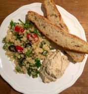 Zutaten für Personen Rezept mit Bild: Tabouleh / Couscous-Salat Bild einstellen 4 Gläser Wasser entsprechende Menge Couscous - siehe Beschreibung Bund glatte Petersilie 1 Handvoll Minzblätter 1 Stück Z [...]