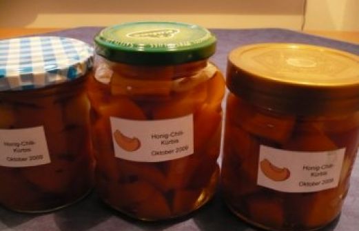 Zutaten für Personen Rezept mit Bild: Honig - Chili - Kürbis Bild einstellen 2 kg Kürbis 100 g Schalotten 2 rote Chilischoten 0.5 Bund Dill 200 g flüssiger Honig 200 g Zucker 3/8 l Weißweinessig [...]