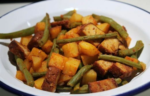 Die Teufelskartoffeln kennt ihr ja schon. Ich habe das Gericht ziemlich frei abgewandelt, als Eiweißquelle gibt es Tofu statt Kichererbsen und als Grünzeug Bohnen statt Rucola.