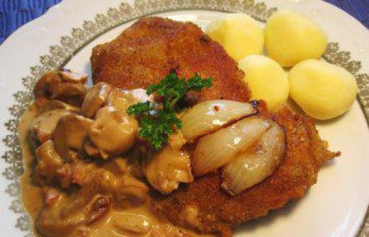 Zutaten für Personen Rezept mit Bild: Schnitzel mit Rahm-Champignons Bild einstellen 2 dicke Schnitzel vom Schweinenacken Pfeffer, Salz Paprikapulver scharf Mehl 1 Ei aufgekleppert Semmelbrö [...]