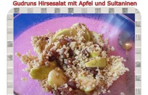 Zutaten für Personen Rezept mit Bild: Salat: Hirsesalat mit Apfel und Sultaninen Bild einstellen 100 Gr. Hirse Wasser 1 kleiner Apfel, in länglichen Schnitzel 1 handvoll Sultaninen 3 päckchen Va [...]