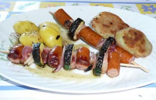 Zutaten für Personen Rezept mit Bild: Grillen: Wurstspieße mit gebackenem Kohlrabi und Kräuterkartoffeln Bild einstellen Für die Wurstspieße 3 Grillwürste 2 kleine Zucchini 5 kleine Schalotten länglich [...]