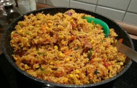 Zutaten für Personen Rezept mit Bild: Paella Bild einstellen 1 Tasse Reis 100 g Hähnchenbrust gebraten 100 g Chorizowurst 100 g Garnelen TK 1 Möhre 2 Frühlingszwiebeln 1 Zwiebel 2 Knoblauchze [...]