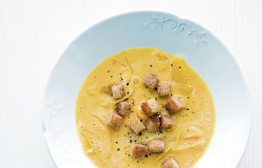 Kürbis-Orangen-Suppe mit Zimtcroûtons Zutaten 400 g Hokkaido-Kürbis 1 Zwiebel 20 g frischer Ingwer 1 saftige Bio-Orange 2 EL Olivenöl 500 ml Gemüse- oder Geflügelbrühe 200 ml frisch gepresster Orangensaft (aus 3-4 Orangen) 2 Scheiben Toastbrot 30 g Butterschmalz 1 TL Zimtpulve [...]