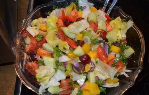 Zutaten für Personen Bild einstellen 0.5 Kopf Eisbergsalat frisch 0.5 Stk. Gemüsepaprika gelb frisch 1 Stk. Salatgurke klein 2 Stk. Tomaten frisch 1 Bund Petersilie kraus frisch 1 Rebe Weintraube rot frisch 0.5 Tasse [...]