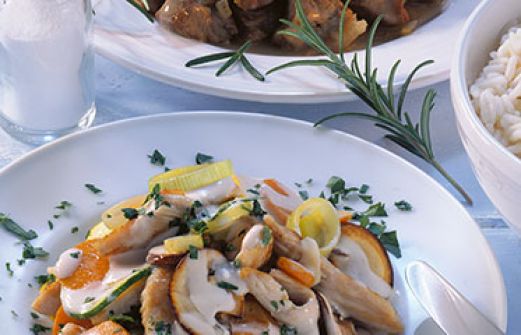 Putengeschnetzeltes mit Gemüse Zutaten 600 g Putenbrustfilet Salz Pfeffer 200 g kleine Egerlinge 2 kleine Zucchini 1 Stange Lauch 2 Möhren 3 Knoblauchzehen 4 EL Öl 1/4 l Hühnerbrühe (Instant) 150 g Crème fraîche 2 EL gehackte Petersilie 600 g Putenbrustfilet , [...]