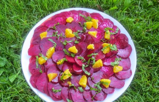 Ein sog. Carpaccio von Roter und Gelber Bete mit einer Orangen-Olivenöl-Emulsion und Orangenfilets sah so frisch bunt knackig aus, dass ich nicht widerstehen konnte.
