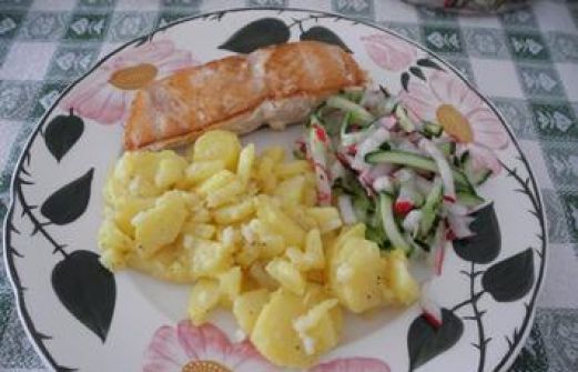 Zutaten für Personen Rezept mit Bild: Lachs an schwäbischen Kartoffelsalat mit Radieschen-Gurken-Salat Bild einstellen 1 ½ kg gekochte Pellkartoffeln heiß 1 kleine Zwiebel gehackt etwas Essig e [...]
