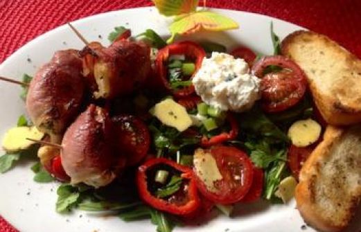 Zutaten für Personen Rezept mit Bild: Gefüllte Datteln auf Salat Bild einstellen 6 Datteln frisch 4 Esslöffel Ricotta 6 Scheiben Landschinken 1 Knoblauchzehe gehackt 1 Bund Rucola 0.5 Teelöf [...]