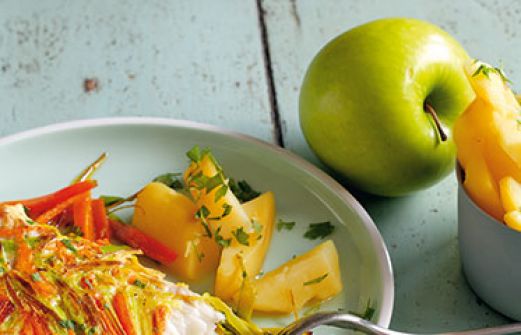Kabeljau im Gemüsemantel Zutaten 750 g Kartoffeln Salz 2 Möhren 1 Lauchstange 300 g Kabeljaufilet 3-4 EL Mehl schwarzer Pfeffer aus der Mühle 1 Ei 2 EL Olivenöl 2-3 EL gehackte Petersilie 2 große Äpfel 750 g Kartoffeln , Salz , 2 Möhren , 1 Lauchs [...]