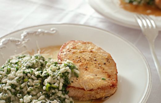 Medaillons vom Schwein mit grünem Risotto Zutaten 2 Frühlingszwiebeln 2 Knoblauchzehen 150 g Brennnesselspitzen 50 g Butter 250 g Risottoreis 50 ml trockener Weißwein (ersatzweise Gemüsebrühe) knapp 1 l heiße Gemüsebrühe 2 EL frisch geriebener Parmesan Salz Pfeffer 4 Schw [...]