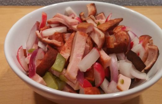 Zutaten 1 rote Zwiebel 400g Leberkäse oder Fleischwurst 1 Bund Radieschen 150g Gewürzgurken + 5 EL Gurkenwasser 3 EL Weißweinessig 1 TL Senf Salz Pfeffer 3 EL Öl Zubereitung Zwiebeln halbieren und in dünne Streifen schneiden. Leberkäse/Fleischwurst, Radieschen und Gurken ebenfal [...]