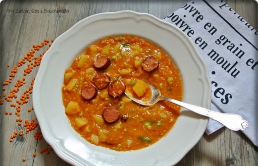 Letzten Samstag gab's Linsensuppe, die wir wirklich gerne mögen, erstmals mit roten Linsen - und wahrscheinlich essen wir sie jetzt nur noch so ;-)