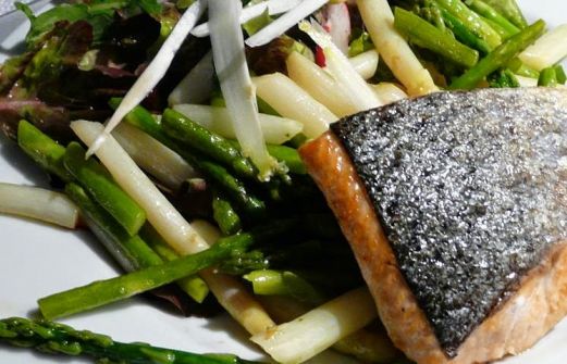 Grünen und weißen Spargel sanft anbraten, etwas ruhen lassen.