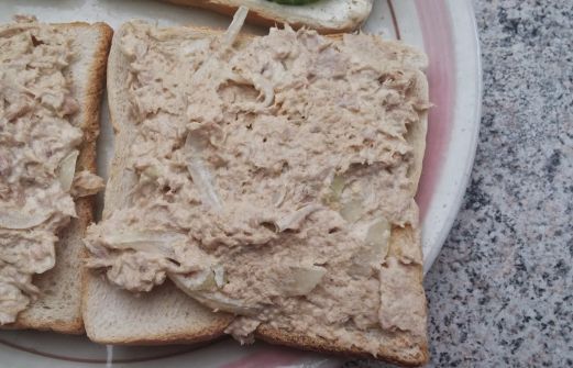 Thunfischwasser abgießen, Thunfisch in eine Schüssel geben und zerpflücken.