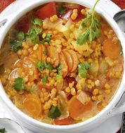 für 4 Personen 400 g Hähnchenbrust 250 g Möhre 1 Stk Knoblauchzehe 30 g Ingwer 2 TL Olivenöl Salz und Pfeffer aus der Mühle 150 g rote Linsen 1 TL gemahlener Kreuzkümmel 900 ml Geflügelbrühe 2 Bund Frühlingszwiebeln 1/2 TL Chiliflocken 1 Bund Koriander Zubereitung: Möhre schälen, [...]
