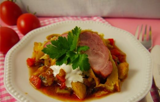 Zutaten: 250 - 500 g gekochten Schinken / Kassler 2-4 Teel. Honig-Senf Blätterteig 1 Eigelb verschiedene Gemüsesorten (was gerade vorrätig ist) selbstgemachte Tomatensoße Rosenblüten-Salz Rosenblüten-Pfeffer Feigen-Balsam Saure Sahne Zubereitun [...]