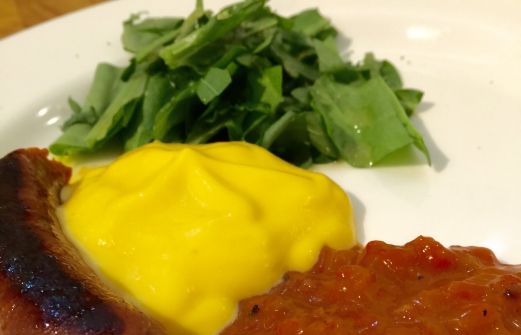 Merguez, selber gemacht aus Rind und Lamm. Dazu eine selber gemachte Paprika Salsa mit über dem Holzkohlengrill angerösteten Paprika. Rührei aus dem Sahnebläser und ein Sauerampfer-Rucola-Salat.