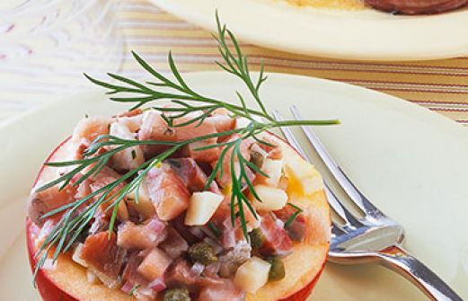 Matjestatar in Äpfeln Zutaten 4 Matjesfilets in Öl 2 Schalotten 2 Äpfel (Royal Gala) 2 TL Zitronensaft 1 EL Kapern 1 EL Dillspitzen Salz weißer Pfeffer Dillzweige zum Garnieren 4 Matjesfilets in Öl , 2 Schalotten , 2 Äpfel (Royal Gala) , 2 TL Zit [...]