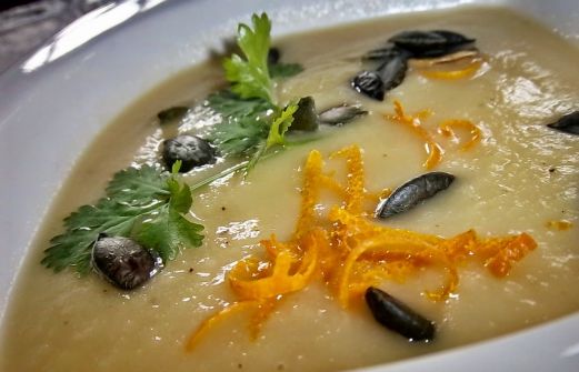 30 g Butter 1 Zwiebel 1 l Gemüsebrühe 200 g Doppelrahm-Frischkäse 150 g Sahne 1 Orange