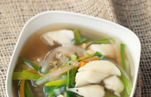 Fischsuppe mit Gemüsestiften Zutaten 1 dicke Möhre 1 Stück weißer Rettich (ca. 120 g) ½ Stange Lauch (grüner Teil) 450 g Seelachsfilet 1 Stück Ingwer (ca. 4 cm) 1,2 l Fisch- oder Gemüsebrühe 4 EL trockener Sherry 4 EL Sojasauce 2 EL frisch gepresster Zitronensaft Salz Pfe [...]