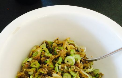 Diesmal werden die Auberginen im Dampfgarer zubereitet. 30min dämpfen, auskühlen lassen, schälen, zerzupfen und in einem Sieb abtropfen lassen. Mit geröstetem Sesam und einer Marinade aus Sojasauce, Mirin, Erdnussöl, Reisessig, Ahornsirup, gehacktem Knoblauch, Ingwer und Salz gut vermischen und [...]