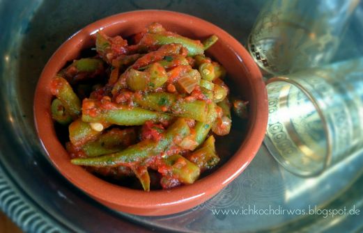 Im Garten müssen nun die Bohnen gepflückt werden. Ich mache daraus gerne dieses orientalische Gericht, das kalt und warm schmeckt. Heute wird es unsere kalte Beilage zu gegrillten Hähnchenschenkel sein.