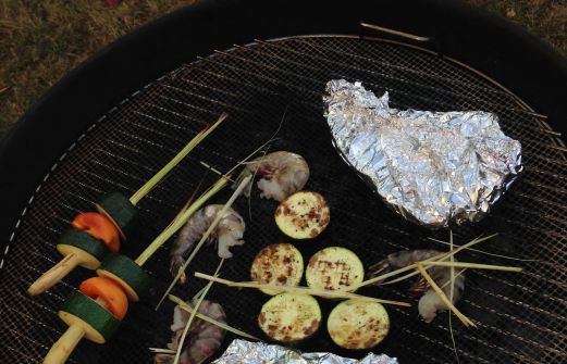 So entstand der Plan, außer dem letzten Stück Pferdesteak und ein paar AuberginenTomatenKräuterPäckchen dicke Garnelen mit Zucchini und Aprikosen auf Zitronengras augespießt zu grillen.