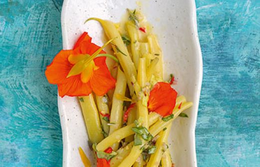 Wachsbohnen-Kresse-Salat Zutaten 500 g Wachsbohnen 2 Zweig Bohnenkraut 50 g zarte Kapuzinerkresse mit Blüten 1 Schalotte 1/2 rote Chilischote 3 EL Rapsöl 1 EL mittelscharfer Senf 4 EL Weißweinessig Salz Pfeffer Anzahl Portionen: Zutaten für 4 Personen Zubereitungszei [...]