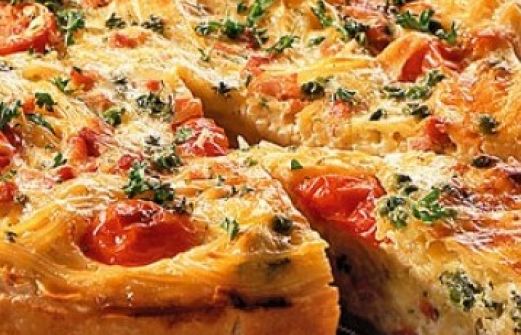 300 g TK- Blätterteig 150 g Spaghetti Salz 70 g Kirschtomaten 100 g gekochter Schinken 250 g Schmand 3 Eier (Kl. M) Pfeffer Muskat 100 g TK- Erbsen 100 g geriebener Gouda 3 El gehackte Petersilie