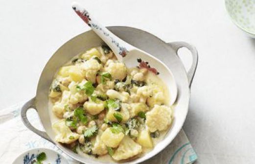 Blumenkohl-Kichererbsen-Curry Zutaten 300 g Kartoffeln 300 g Blumenkohl 1 Dose Kichererbsen (425 g) 200 g frischer Blattspinat 1 Zwiebel 1 Knoblauchzehe 1 EL Olivenöl 1 TL edelsüßes Paprikapulver 2 TL Currypulver 300 ml Gemüsebrühe (Instant) 200 g Sojajoghurt 1 TL Spei [...]