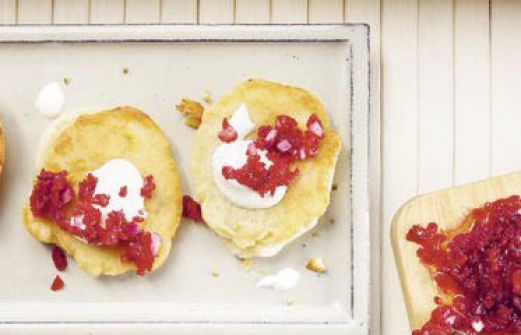 Blini mit Rote-Bete-Kaviar Zutaten 100 g Räuchertofu 200 g Buchweizenmehl 2 TL Backpulver 5 TL Olivenöl 1 weiße Zwiebel Salz Pfeffer 1 Glas oder Dose auser eingelegte Rote Bete (425 ml ) 1 rote Zwiebel 150 g saure Sahne neutrales Pflanzenöl zum Braten Anzahl Porti [...]